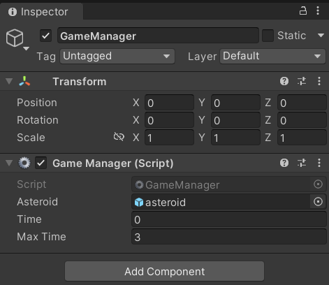 랜덤으로 소행성이 날아오게 만들기 위해서 빈 오브젝트를 하나 생성하여 스크립트를 추가한다.
