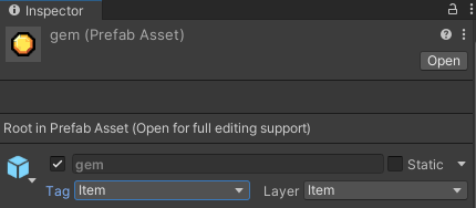 gem 프리팹에서는 Tag와 Layer가 Item으로 되어있는지를 확인한다.