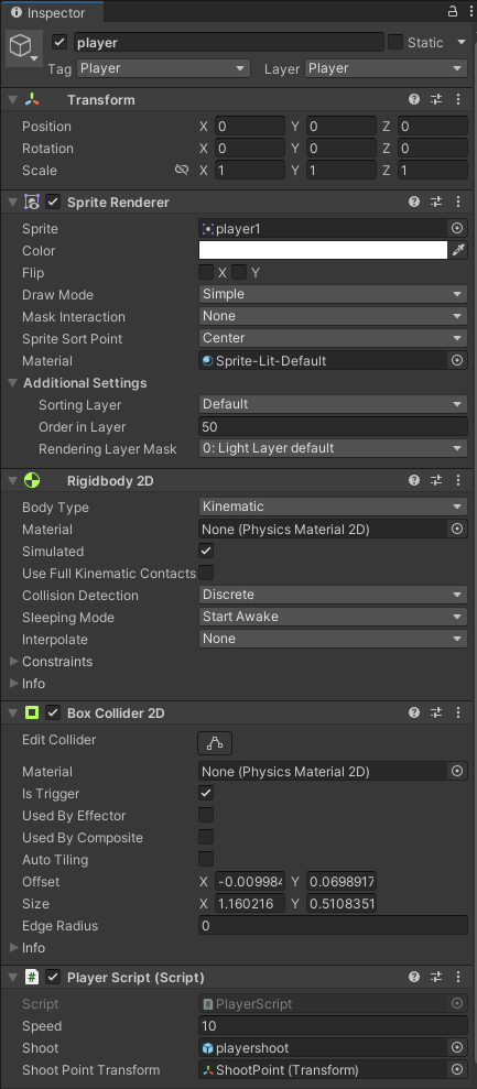 플레이어에서 Rigidbody 2D - [Kinematic], Box Collider 2D - [Is Trigger]을 체크한다.