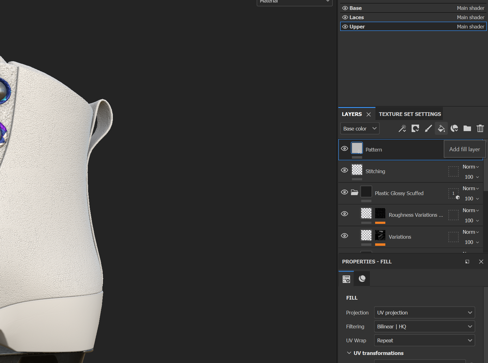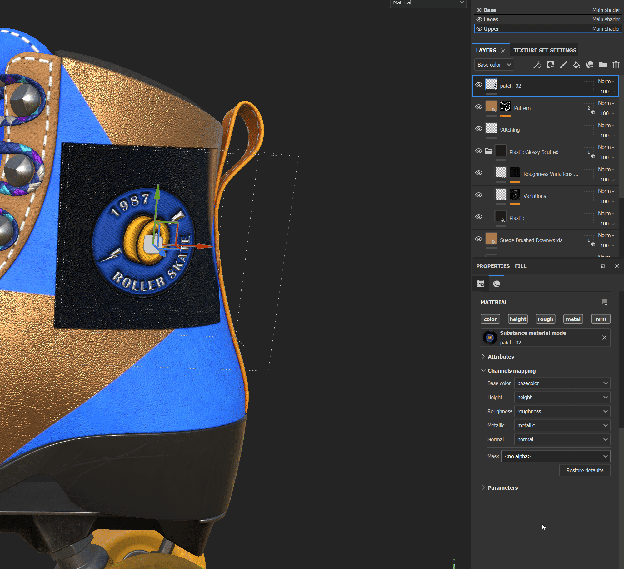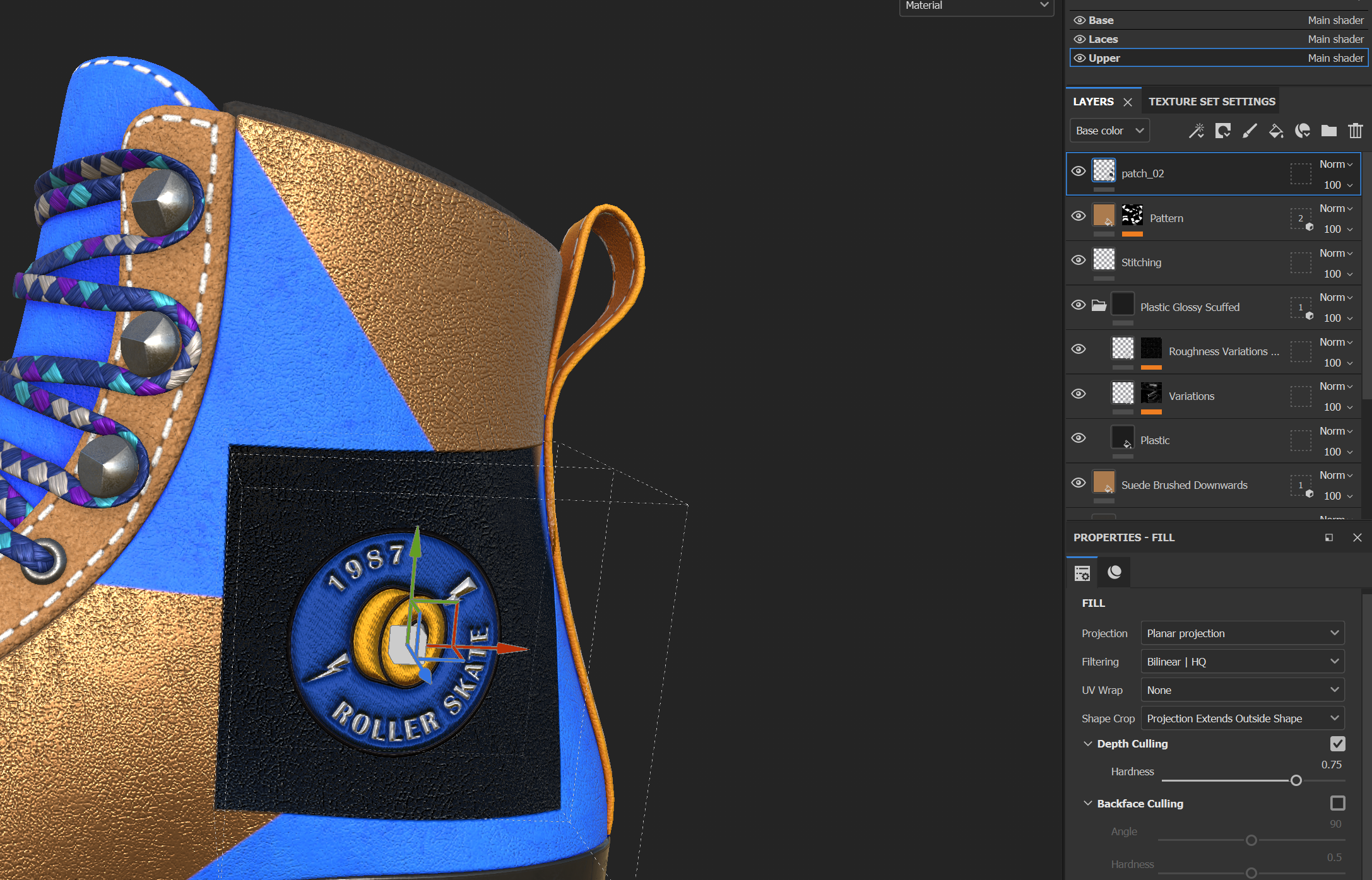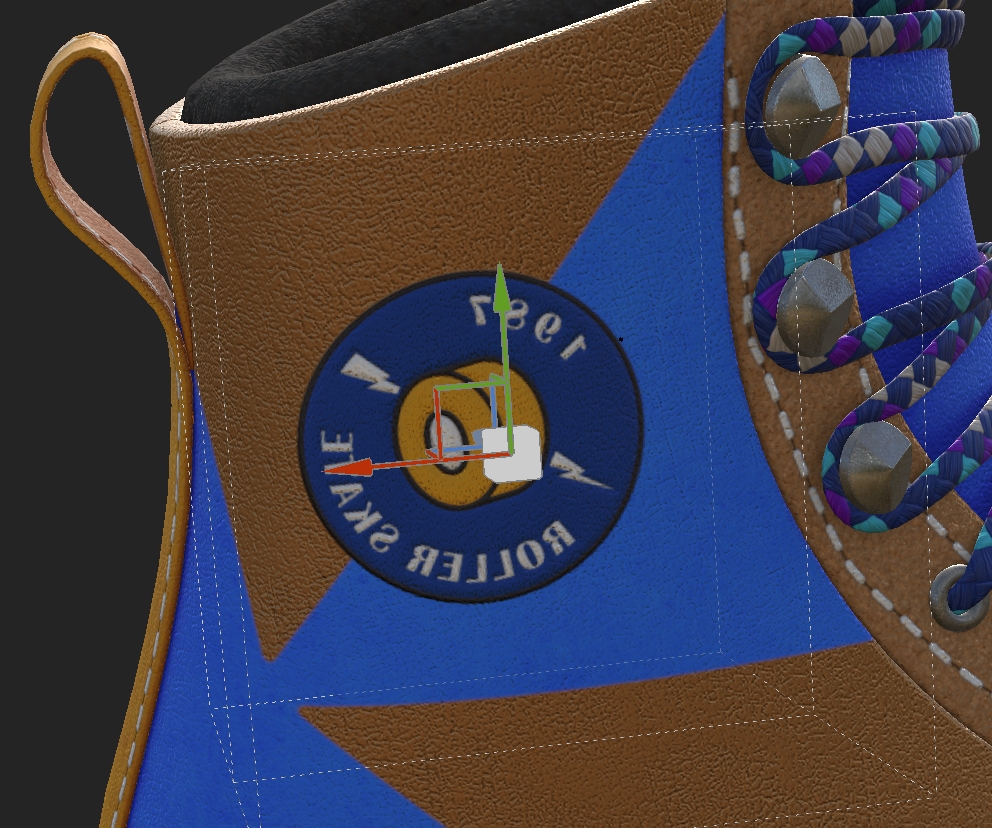 "patch_02"라는 이름으로 패치가 들어온 것을 material libraries에서 확인할 수 있고, 드래그 앤 드랍하여 부츠에 적용한다.