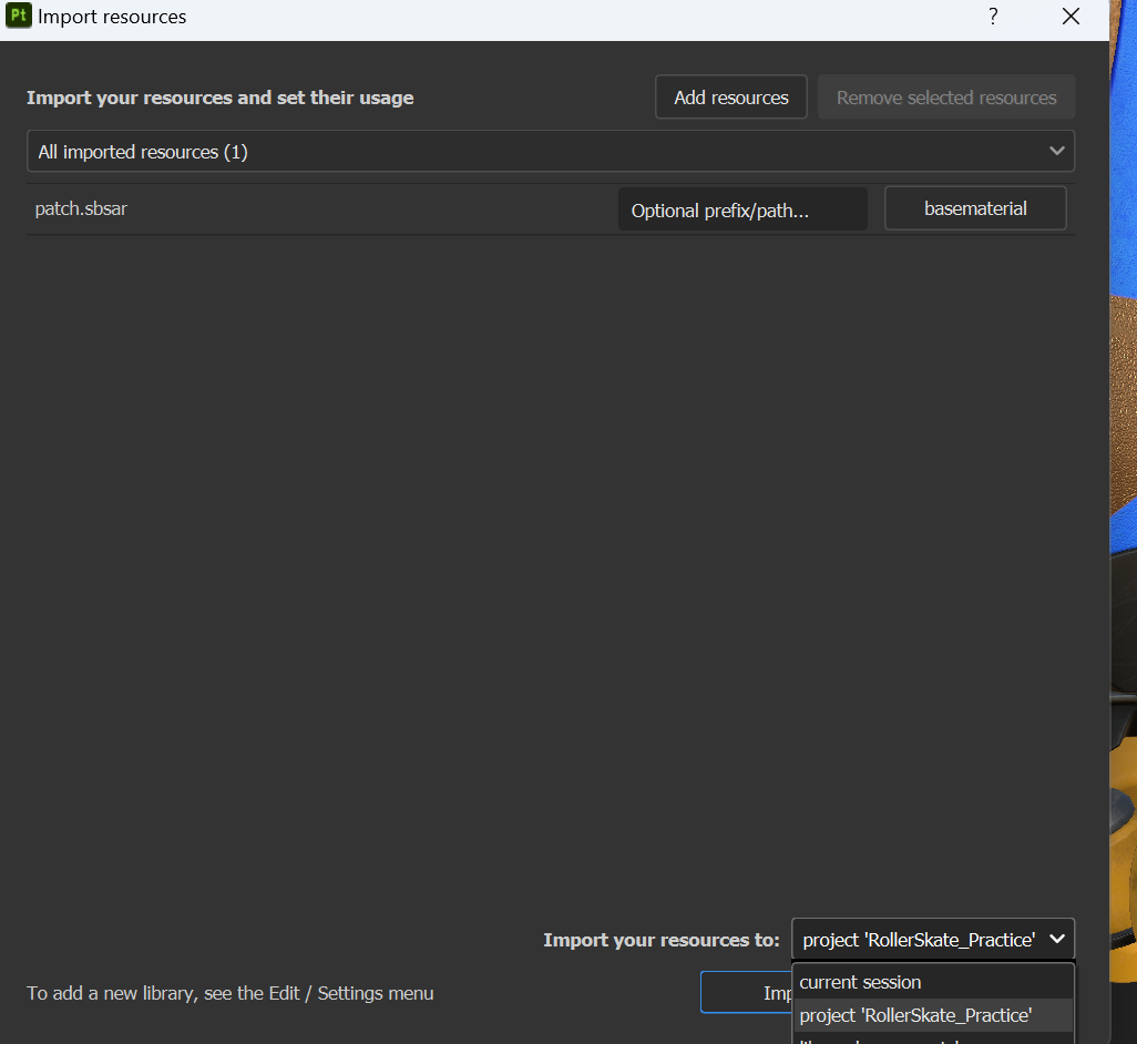 이 영상에서 공유해 준 Content에서 "patch.sbsar" 파일을 [Import resources...]로 추가한다.